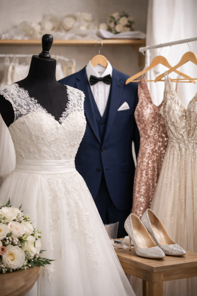 Dry cleaning and alterations for wedding dresses and formalwear, based on fabric type and care label requirements. This includes suits, tuxedos, formal dresses, and party wear that need careful finishing and fit adjustments. Custom design work is available for tailored changes. Bring the garment in for review and we will confirm what is feasible and recommend next steps.